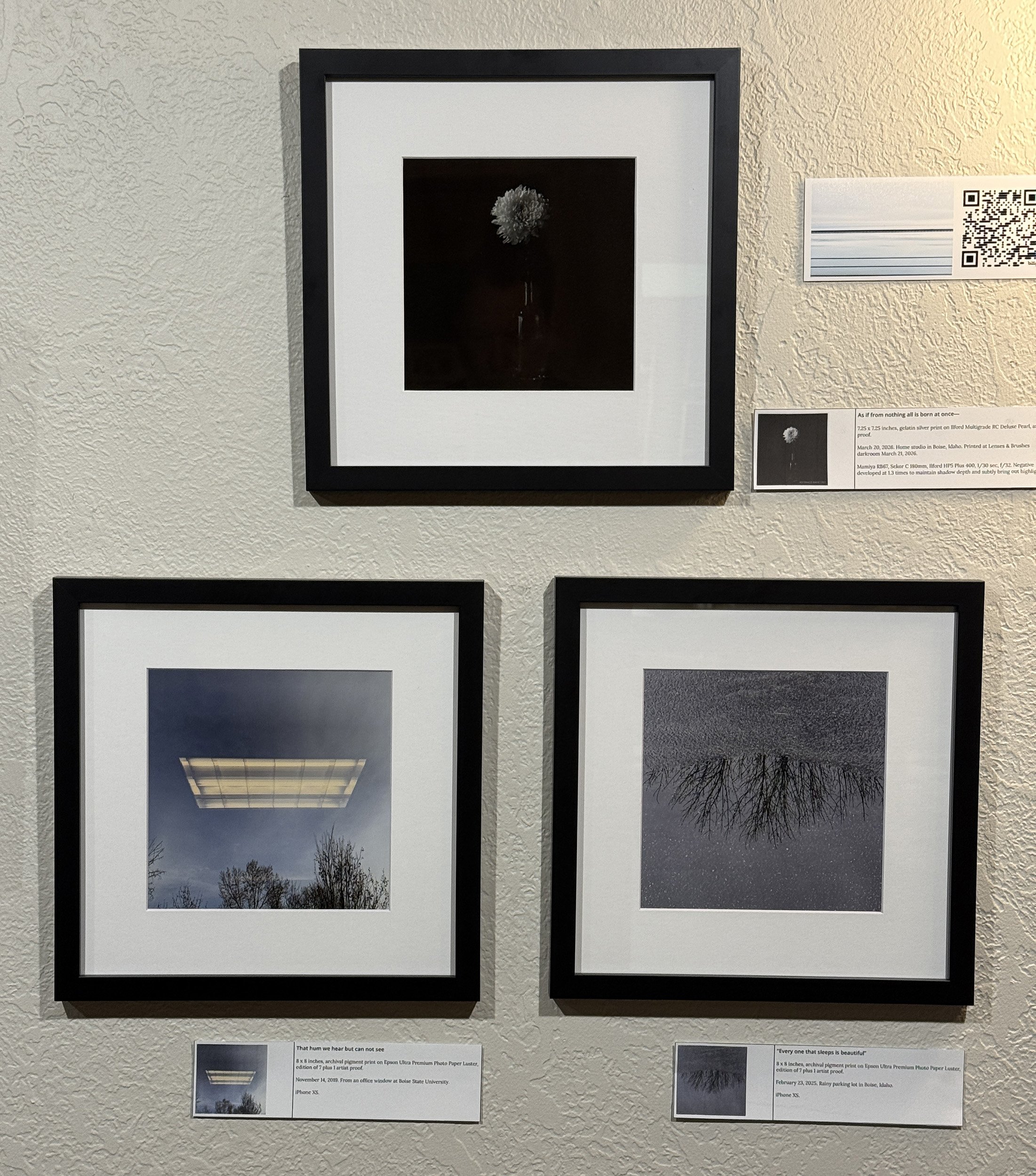 This show includes small works (7.25x7.25in to 12x18in) from several ongoing projects made with digital and film cameras in studio and in wild environments.